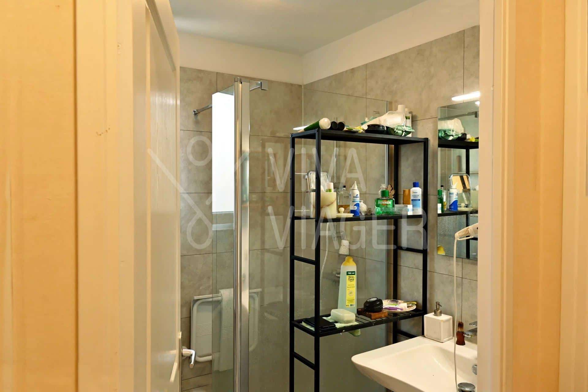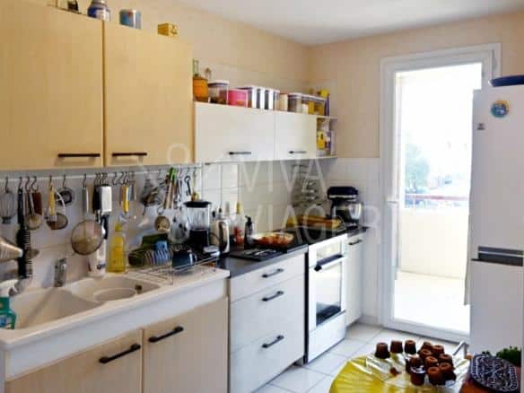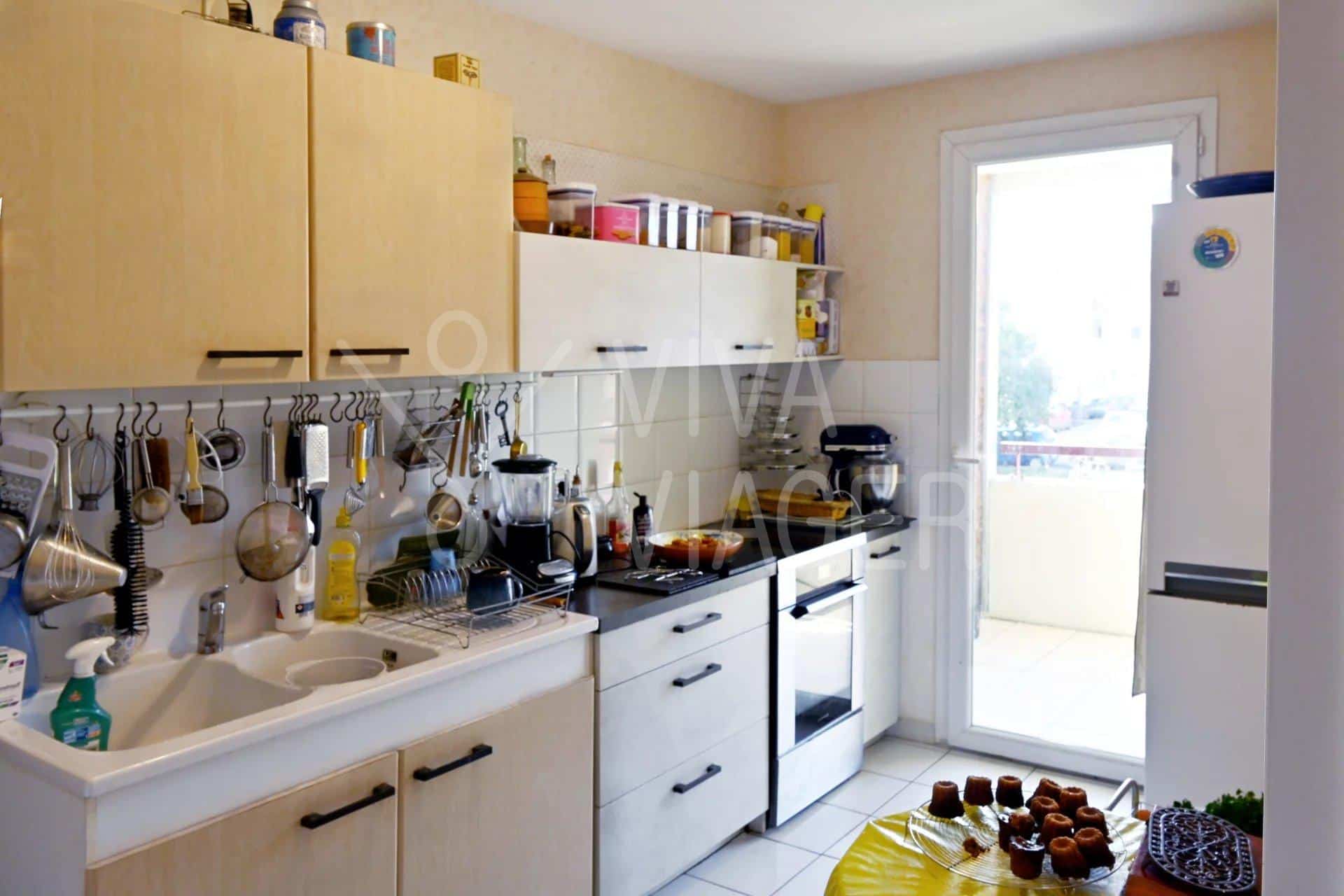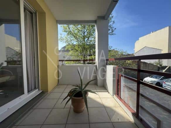 Il comprend une entrée, un séjour, une cuisine, deux chambres avec placard, un dégagement, un cellier, une salle de douche entièrement rénovée, un WC séparé et deux balcons d’une surface globale d’environ 9m². Un garage fermé et une place de parking extérieure complètent le bien.