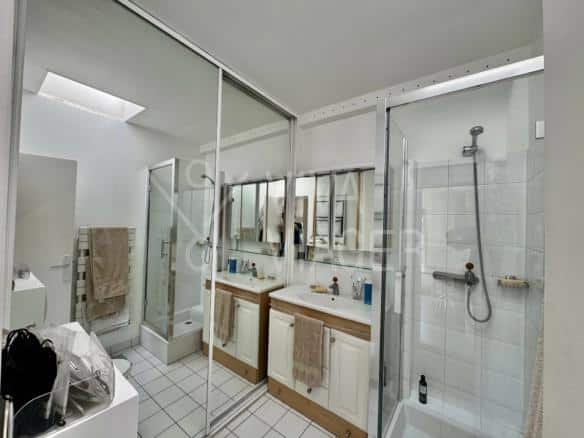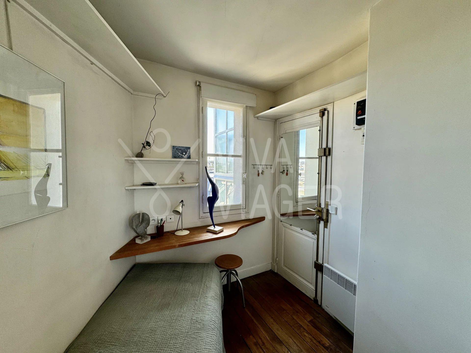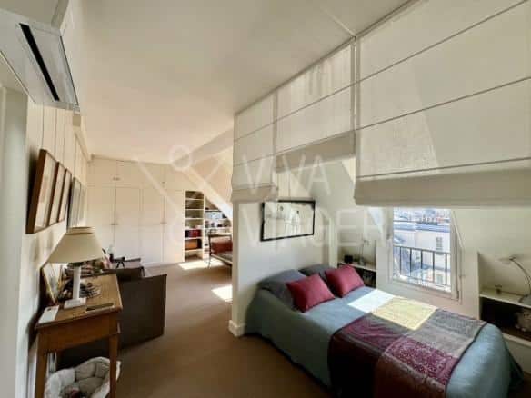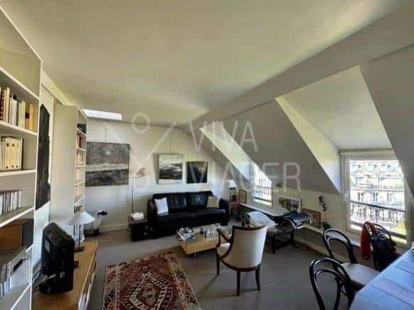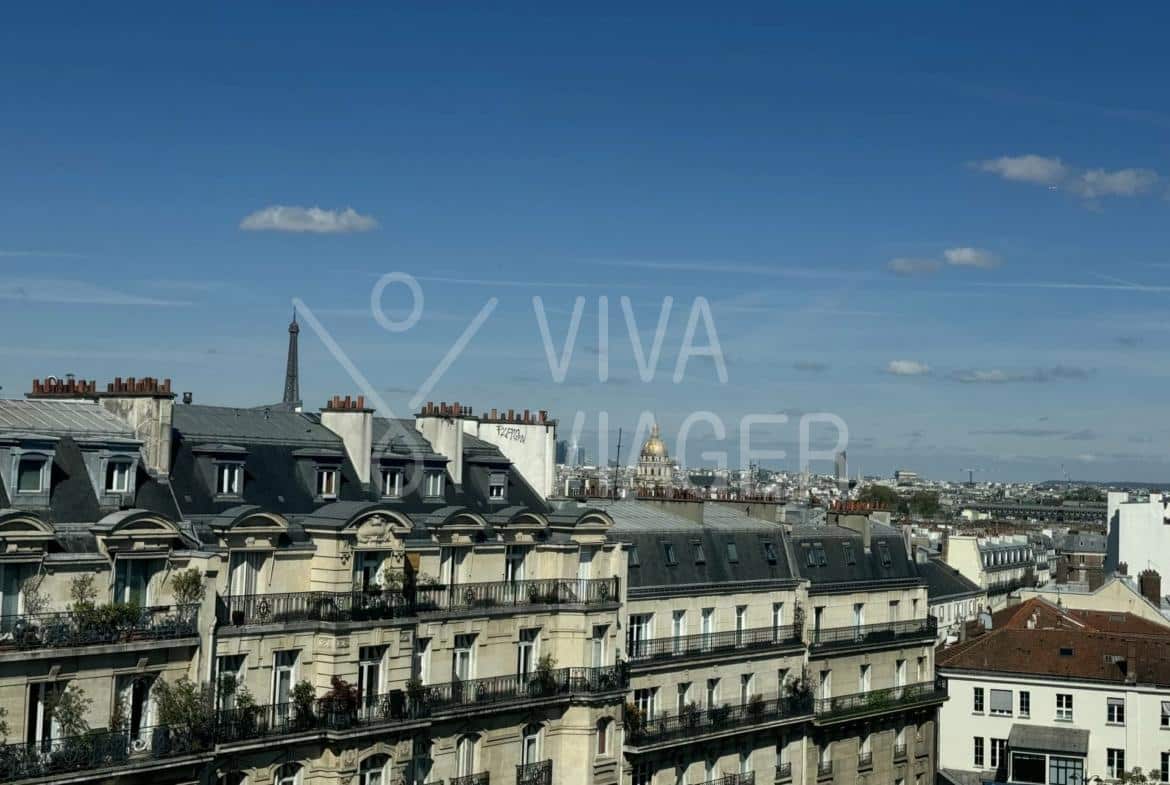 Au 8ème et dernier étage, cet appartement traversant de 65 m² offre une vue imprenable sur les monuments parisiens. Il bénéficie d’une luminosité exceptionnelle grâce à sa double exposition.
