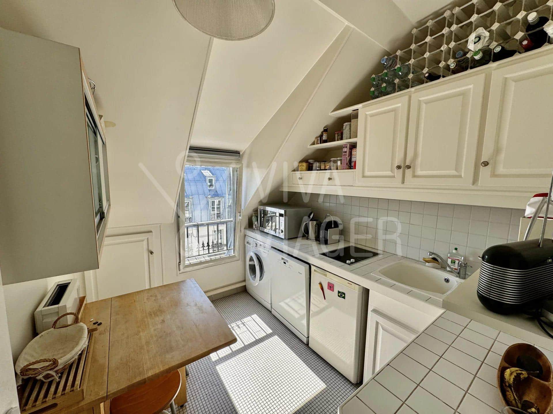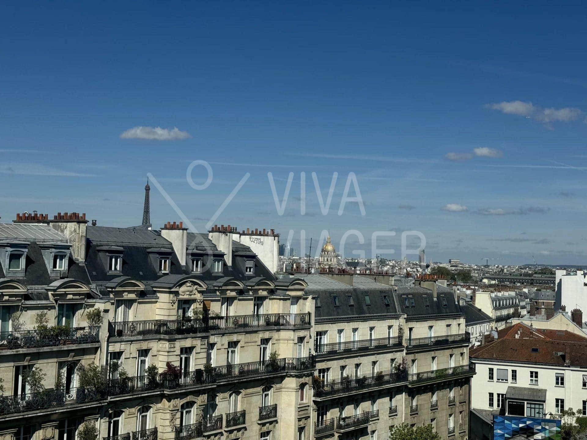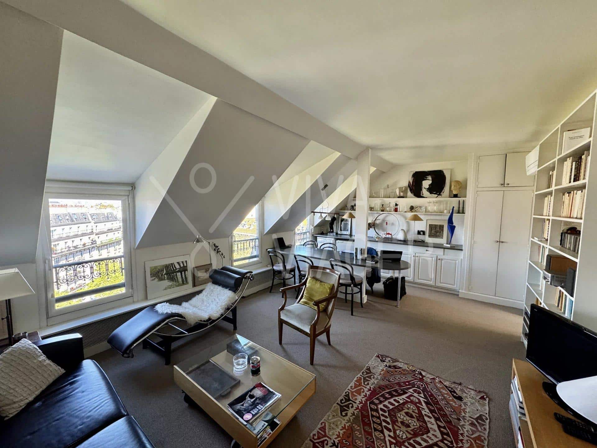 Au 8ème et dernier étage, cet appartement traversant de 65 m² offre une vue imprenable sur les monuments parisiens. Il bénéficie d’une luminosité exceptionnelle grâce à sa double exposition.