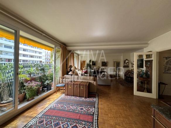 Au calme des jardins de la copropriété, cet appartement traversant est composé d’une entrée, double séjour de 45m² avec petits balcons, salle à manger (possibilité d’une 3eme chambre), cuisine séparée donnant sur une coursive avec vue tour Eiffel, 2 chambres, w-c séparés, salle de bains.