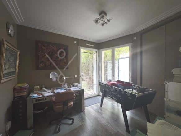 Une chambre-bureau avec salle d’eau attenante et accès direct à la seconde terrasse — aménagée en espace salon extérieur avec abri de jardin et véranda — viennent parfaire ce lieu unique.