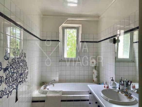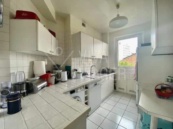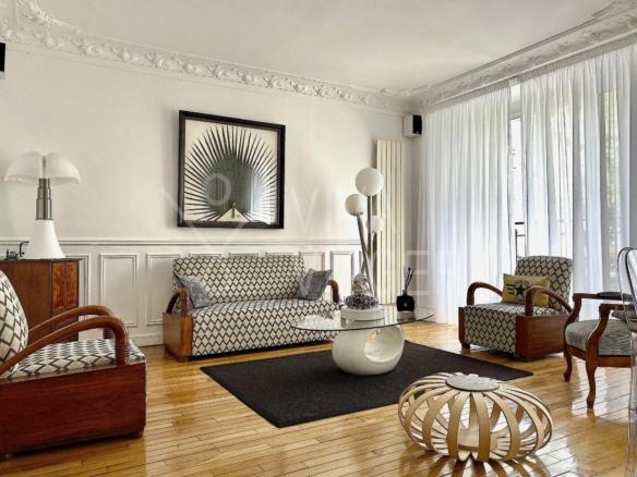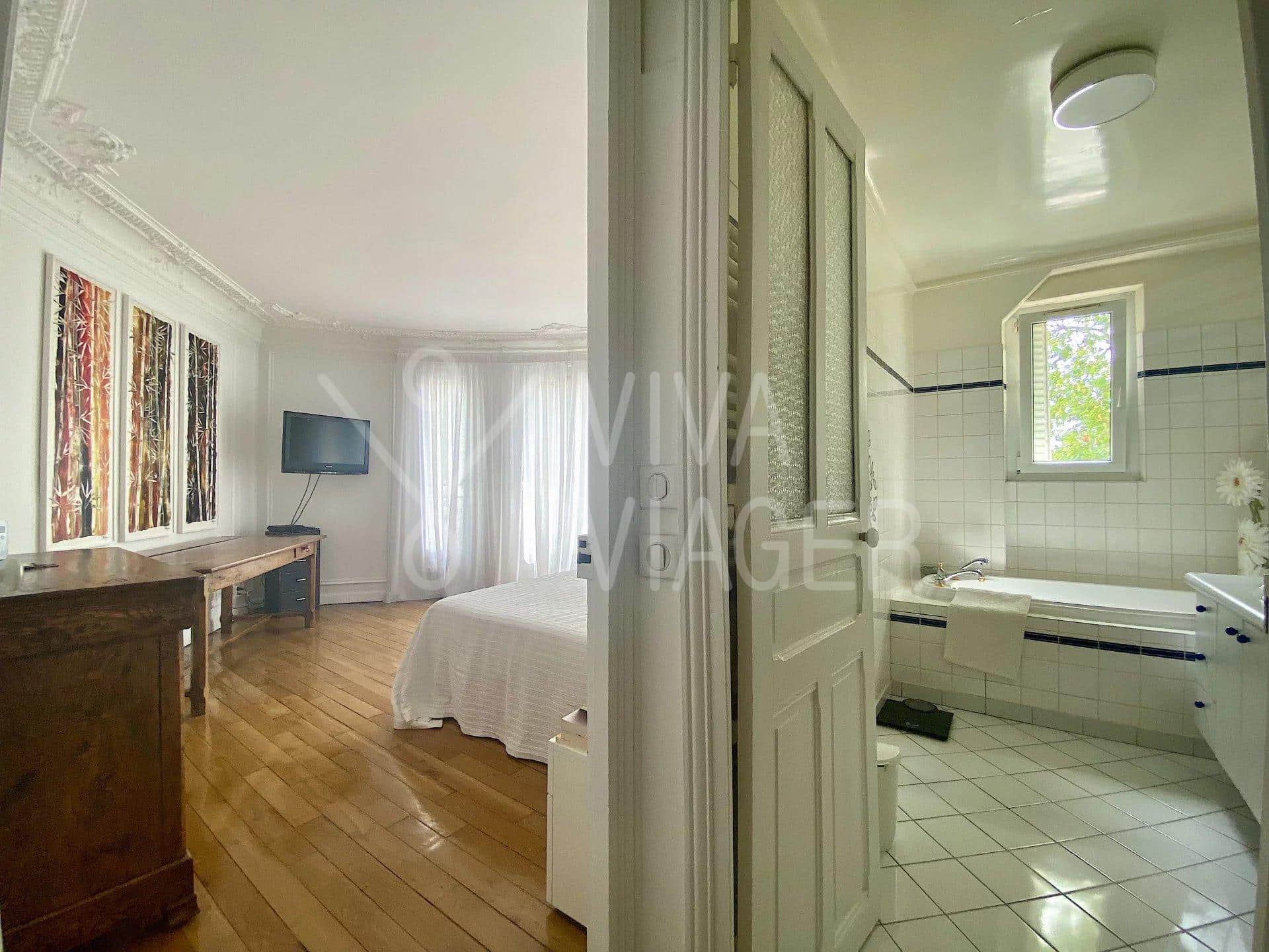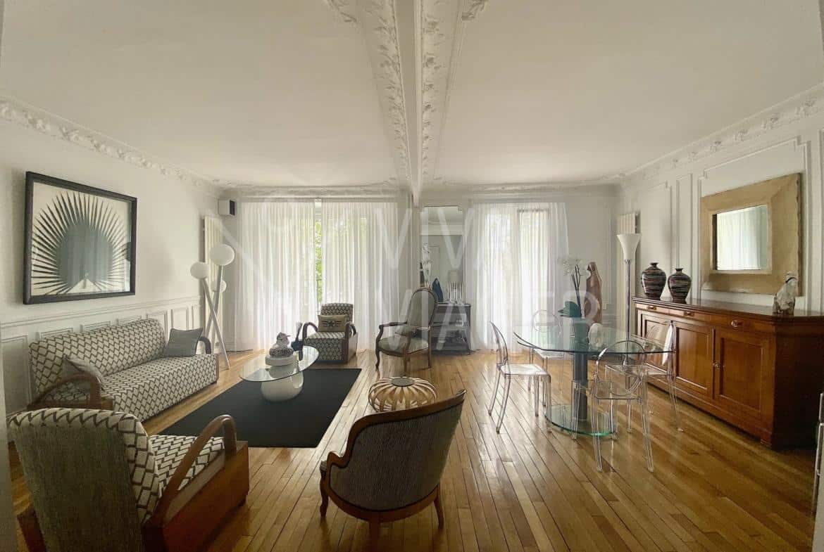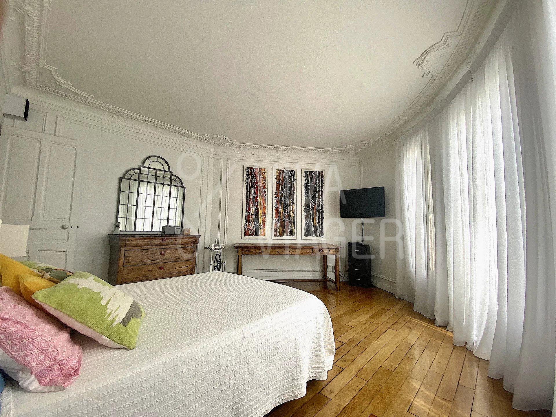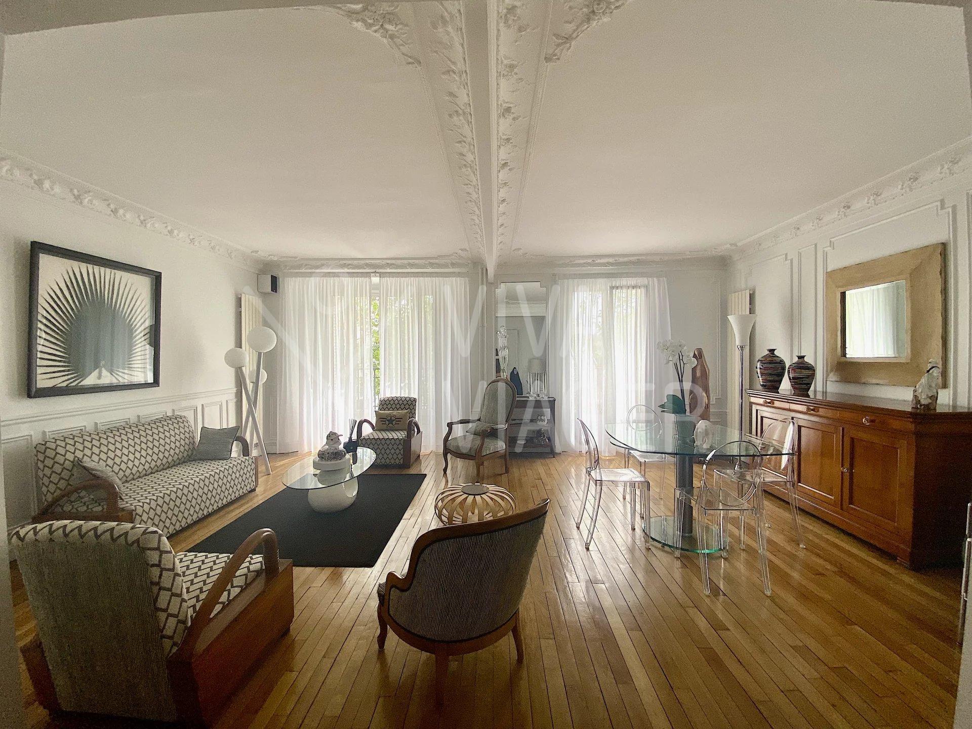 une entrée, un séjour, une salle à manger, deux belles chambres dont une sur un jardin, cuisine séparée et équipée, salle de bains avec douche et baignoire, un grand dressing, WC séparé, et une cave au sous-sol.