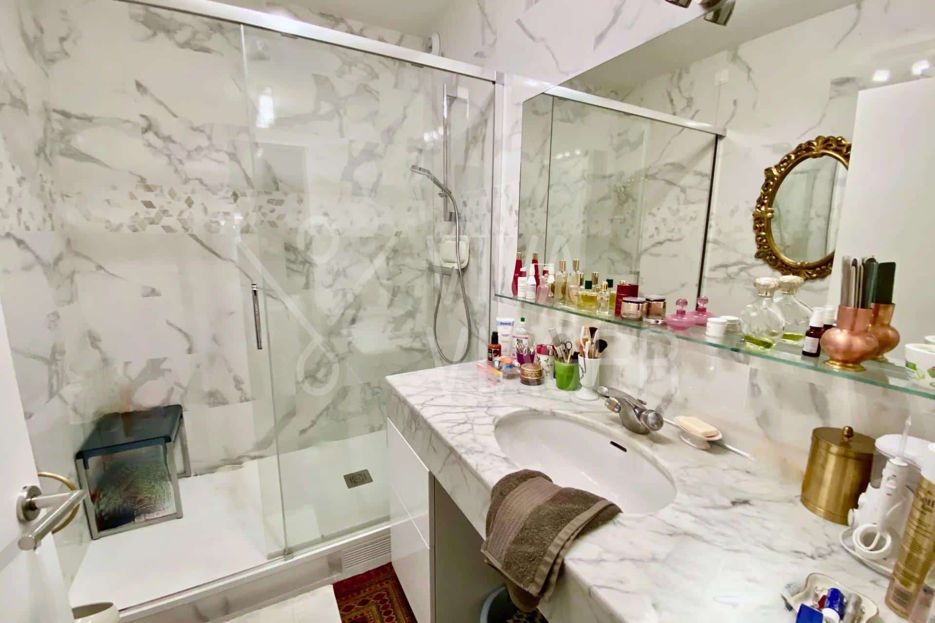 L’appartement comprend une entrée avec rangements, un séjour baigné de lumière, une cuisine équipée et séparée, une chambre, un bureau, une salle de douche avec grande douche à l’italienne et des WC séparés.