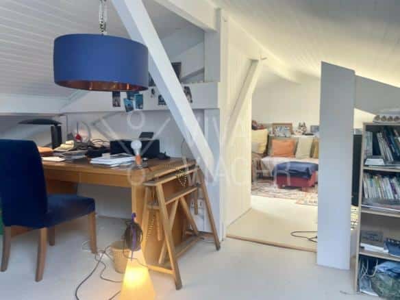 À l’étage, d’une surface au sol d’environ 53 m² (dont 10m² en loi Carrez), vous trouverez une salle de jeux avec espace télévision ainsi qu’un espace bureau sous toit rampant, idéal pour travailler ou se détendre.