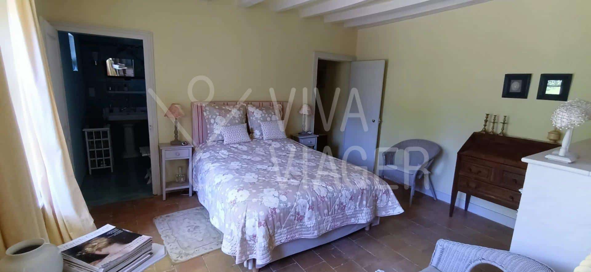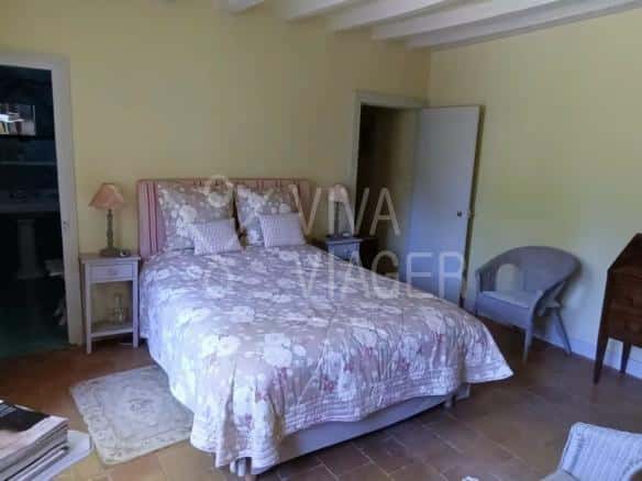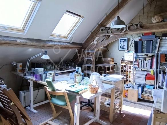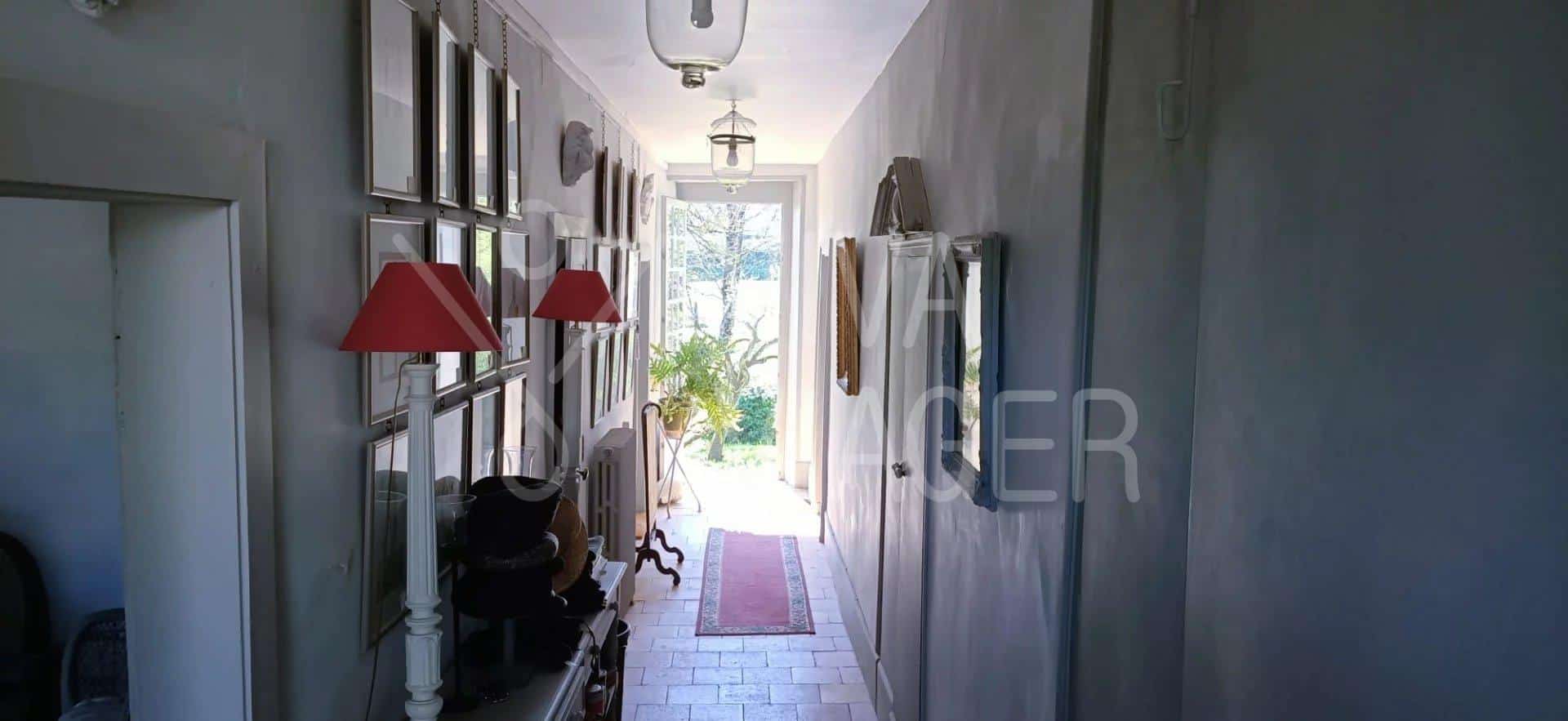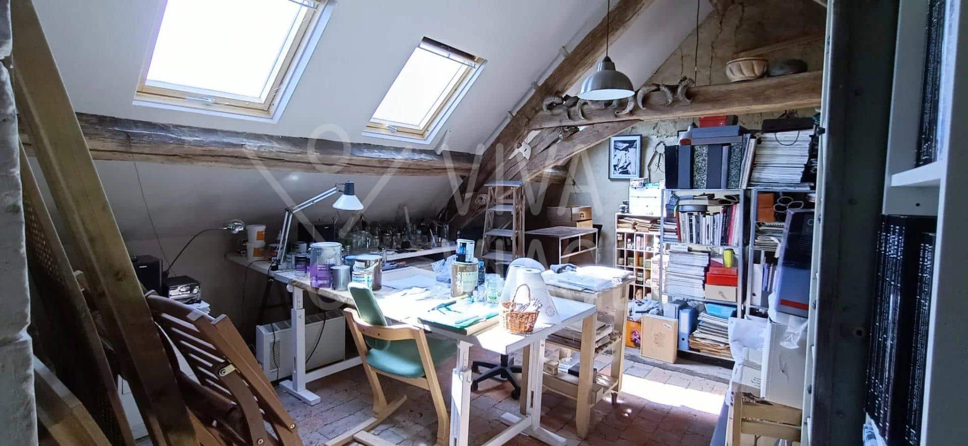 Un vaste grenier aménageable court sous la toiture refaite il y a 10 ans (plus une reprise finale il y a 2 ans). Cette bâtisse est composée de quatre chambres avec chacune une salle de bain, bureau, salon, salle à manger, cuisine, office, boudoir, lingerie, atelier, garage, deux caves, cour sur le devant, à l’arrière de la maison, donnant sur le jardin et la campagne, une grande terrasse orientée plein sud avec une tonnelle ombragée, un puits.